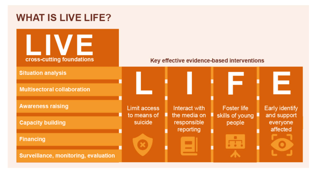 The LIVE cross-cutting foundations include six pillars for suicide prevention, which supports four evidence-based interventions under the acronym L.I.F.E. This model serves as a guide for developing the country’s national suicide prevention strategy.